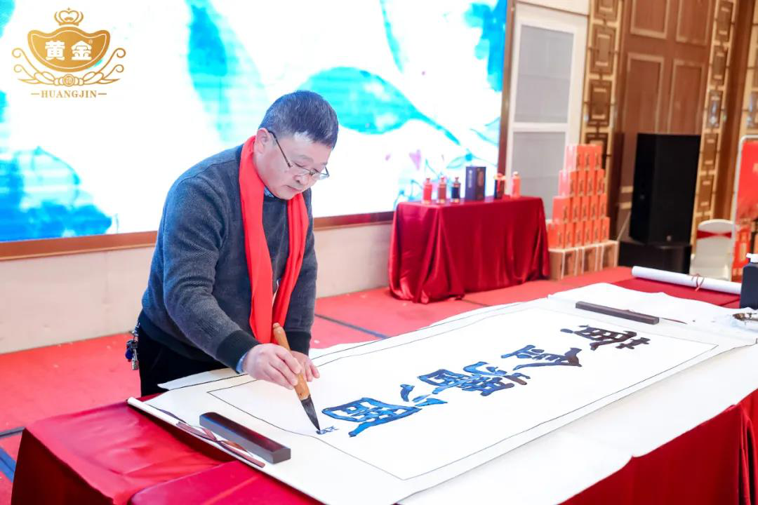 中國書法家協(xié)會遵義書畫院副院長、中國遵義書畫印研究會副會長徐啟剛,黃金酒業(yè)股份董事、執(zhí)行總經(jīng)理姜茂,黃金酒業(yè)股份董事、全國銷售總監(jiān)成云,中國首屆名酒大師、國家一級評酒師、黃金醬酒酒體總設(shè)計師龍則河,黃金醬酒·生肖牛、黃金貢酒全國運營中心總經(jīng)理馬靜以及全國的百余名經(jīng)銷商共同出席了此次大會,論道牛年機遇,共謀發(fā)展藍圖,共啟新年“開門紅”!